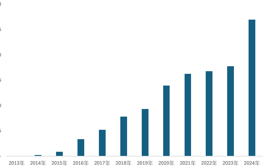 2013-2024年韓國(guó)歷年電化學(xué)儲(chǔ)能裝機(jī)容量規(guī)模走勢(shì)