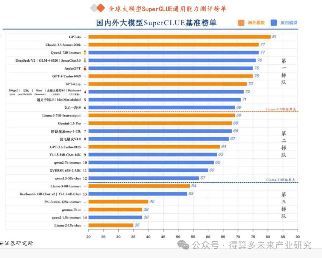 從模型能力來看,根據(jù) SuperCLUE 最新的評測結(jié)果,以開源 Llama 3 70B 、 Llama 3 8B 的模型能力為分界線,國內(nèi)大模型可以形成三大梯隊。可以看到,國內(nèi)大模型上半年發(fā)展尤為迅速,
