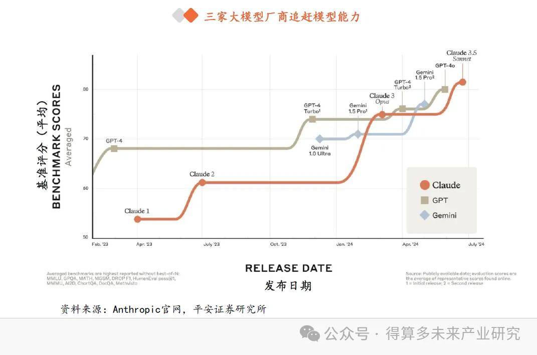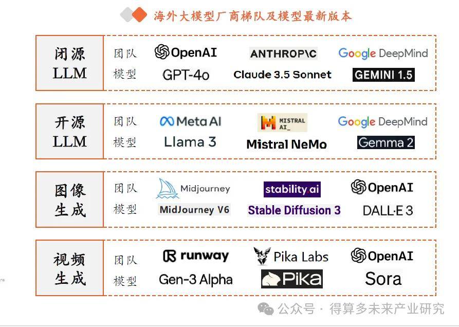 全球大模型競爭中,OpenAI 、 Anthropic 、谷歌三大廠商為第一梯隊, OpenAI 先發(fā)推出 GPT 4 ,在 2023 年基本穩(wěn)定在行業(yè)龍頭地位,而 Anthropic 憑借 Claude 、 谷歌憑借 Gemini 后發(fā),可以看到, 2024 年以來,三家大模型能力呈現(xiàn)互相追趕態(tài)勢。開源大模型廠商中, Meta AI Llama )、歐洲 Mistral AI Mistral )、 Google Gemma )等廠商的大模型性能保持前列。