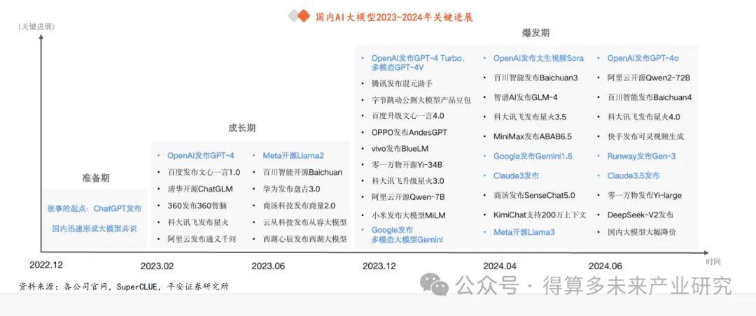 自2022 年 11 月底 ChatGPT 發(fā)布以來, AI 大模型在全球范圍內(nèi)掀起了有史以來規(guī)模最大的人工智能浪潮,國內(nèi)學(xué)術(shù)和產(chǎn)業(yè)界也在抓緊追趕突破。 SuperCLUE 將國內(nèi)大模型發(fā)展大致分為三個階段, 1 )準備期 2022 年 11 月 ChatGPT 發(fā)布 后,國內(nèi)產(chǎn)學(xué)研迅速形成大模型共識。 2 )成長期 2023 年初,國內(nèi)大模型數(shù)量和質(zhì)量開始逐漸增長。 3 )爆發(fā)期 2023 年底至今,各行各業(yè)開源閉源大模型層出不窮,形成百模大戰(zhàn)的競爭態(tài)勢。