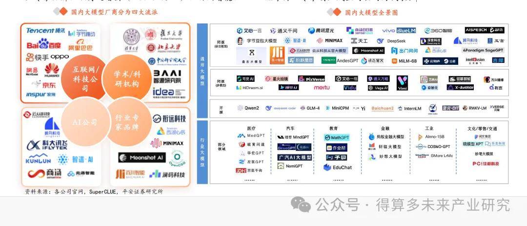 從參與者來看,目前我國 AI 大模型廠商大致可以分為四類, 1 )互聯(lián)網(wǎng) 科技公司:以百度、阿里、騰訊、字節(jié)、快手、華為等為代表。 2 AI 公司:以智譜 AI 、昆侖萬維、科大訊飛、商湯科技為代表的專注于 AI 研發(fā)與應(yīng)用的科技公司。 3學(xué)術(shù)、科研機構(gòu):包括清華、北大、復(fù)旦、中科院等國內(nèi)一流高校,以及智源研究院、 IDEA 研究院等科研機構(gòu)。 4 )行業(yè)專家品牌:以月之暗面( Moonshot AI )、百川智能、 MiniMax 等由 AI 專家創(chuàng)業(yè)成立的公司為代表。