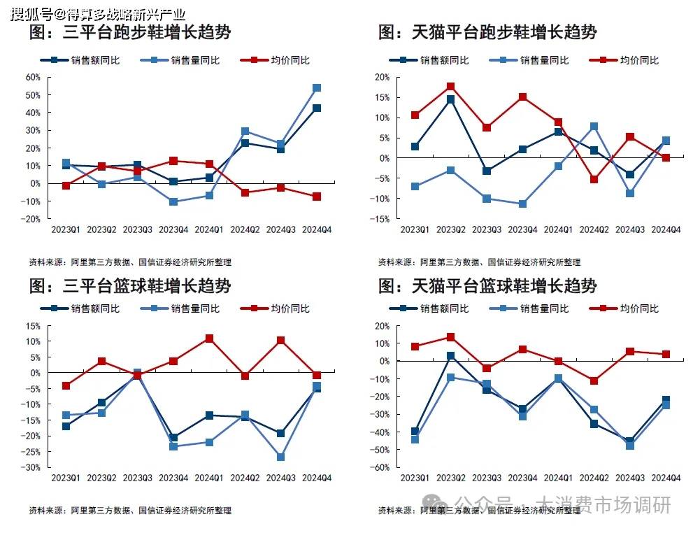 跑步鞋在新平臺(tái)銷(xiāo)量加持下,第四季度銷(xiāo)售額大增超過(guò)40%,均價(jià)小幅下跌。天貓平臺(tái)銷(xiāo)售表現(xiàn)相對(duì)平穩(wěn)。三平臺(tái)跑步鞋2024Q4銷(xiāo)售額同比+42.6%,均價(jià)同比-7.4%;天貓跑步鞋2024Q4銷(xiāo)售額同比+4.3%,均價(jià)同比0%。