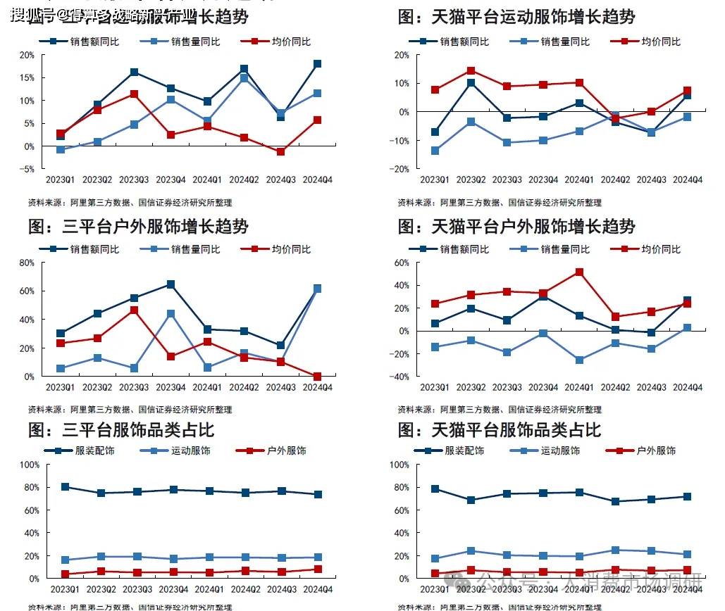 運(yùn)動(dòng)服飾、戶(hù)外服飾均呈現(xiàn)量?jī)r(jià)齊升的趨勢(shì),在2024年線(xiàn)上逐季銷(xiāo)售的增速普遍呈現(xiàn)出年初快速增長(zhǎng)、第三季度達(dá)到年內(nèi)低點(diǎn)、第四季度明顯回升的趨勢(shì)。運(yùn)動(dòng)服飾在三平臺(tái)合計(jì)2024Q4銷(xiāo)售額同比+18%,均價(jià)同比+5.8%;天貓平臺(tái)2024Q4銷(xiāo)售額同比+5.8%,均價(jià)同比+7.4%;戶(hù)外服飾三平臺(tái)2024Q4銷(xiāo)售額同比+61.7%,均價(jià)同比持平;天貓平臺(tái)2024Q4銷(xiāo)售額同比+27.1%,均價(jià)同比+23.8%