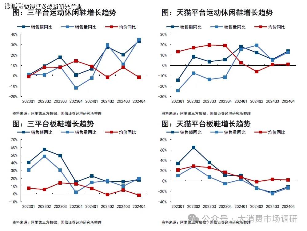 運(yùn)動(dòng)休閑鞋在新平臺(tái)加持和天貓平臺(tái)表現(xiàn)都呈現(xiàn)較快的雙位數(shù)增長(zhǎng),其中主要由銷(xiāo)量驅(qū)動(dòng)。三平臺(tái)運(yùn)動(dòng)休閑鞋2024Q4銷(xiāo)售額同比+33.5%,均價(jià)同比-1.4%;天貓運(yùn)動(dòng)休閑鞋2024Q4銷(xiāo)售額同比+13.9%,均價(jià)同比+1%。
