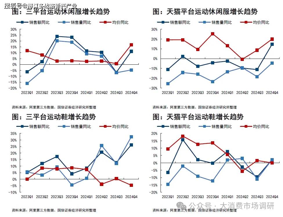 運(yùn)動(dòng)休閑服在第一、第四季度增速都相對(duì)較高,體現(xiàn)出冬季效應(yīng)的催化,并且從量?jī)r(jià)表現(xiàn)來(lái)看,銷(xiāo)量表現(xiàn)相對(duì)平庸而提價(jià)幅度較為明顯,無(wú)論是三平臺(tái)合計(jì)還是提那么平臺(tái)連續(xù)兩年均呈現(xiàn)明顯提價(jià)的趨勢(shì),也顯示出產(chǎn)品結(jié)構(gòu)變化和功能升級(jí)是景氣方向。具體數(shù)據(jù),三平臺(tái)運(yùn)動(dòng)休閑服2024Q4銷(xiāo)售額同比+11.2%,均價(jià)同比+16.7%;天貓平臺(tái)運(yùn)動(dòng)休閑服2024Q4銷(xiāo)售額同比+14.6%,均價(jià)同比+19.9%。