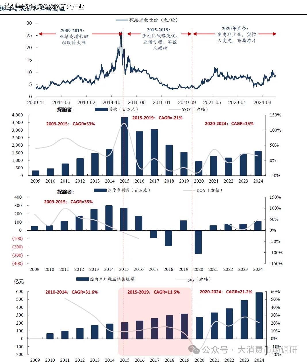 探路者是國內(nèi)第一家上市的戶外用品公司,迄今仍是國內(nèi)第十大高性能戶外服飾品牌。探路者成立于1999年,2009年在深交所上市,為國內(nèi)第一家上市的戶外用品公司,2024年探路者仍是國內(nèi)第十大高性能戶外服飾品牌(市占率約1.0%)。上市以來探路者經(jīng)歷了快速擴(kuò)張(2009-2015年)、戰(zhàn)略失誤(2015-2019年)、業(yè)務(wù)重整(2020年至今)的發(fā)展過程。