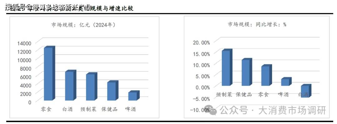 根據(jù)Euromonitor、Frost & Sullivan 以及中國酒業(yè)協(xié)會(huì)的數(shù)據(jù),2024 年,預(yù)制菜、保健品、白酒、啤酒和零食市場(chǎng)的銷售規(guī)模分別增長(zhǎng)了15.6%、11.5%、-5.2%、3%和8.7%,零食市場(chǎng)的增長(zhǎng)低于預(yù)制菜和保健品,但高于白酒和啤酒。