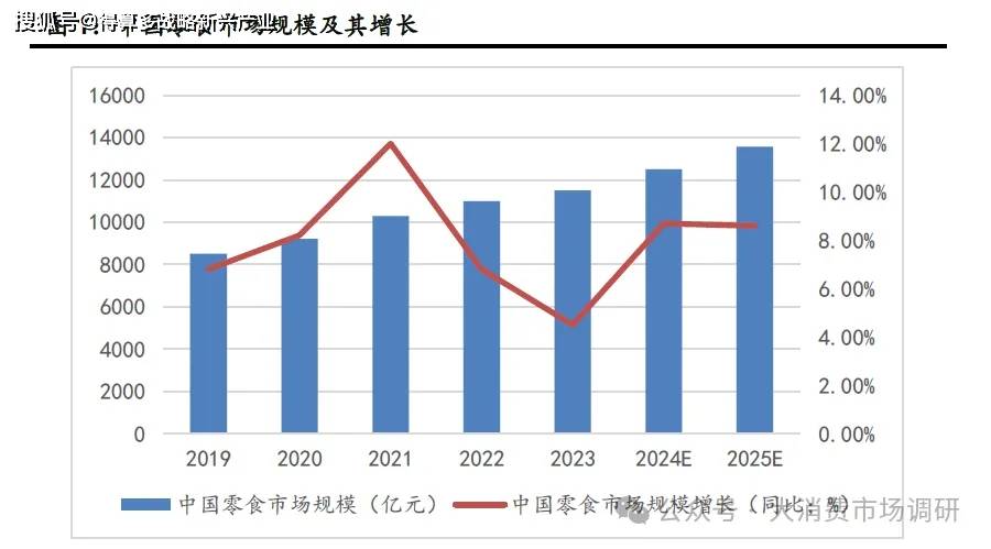 中國零食市場(chǎng)已經(jīng)突破一萬億元,并且以較快的速度增長(zhǎng)著,城鎮(zhèn)化以及產(chǎn)品和渠道創(chuàng)新是零食行業(yè)大步發(fā)展的重要推手。我們認(rèn)為,未來三年零食市場(chǎng)將會(huì)保持在6%至8%的增長(zhǎng)區(qū)間,2026 年有望突破14000 億元規(guī)模。根據(jù)艾媒咨詢的預(yù)測(cè),2024 年中國零食市場(chǎng)的規(guī)模已達(dá)到12500 億元,較2023 年增長(zhǎng)8.7%。零食市場(chǎng)保持了較快的增長(zhǎng),產(chǎn)品創(chuàng)新、渠道創(chuàng)新激發(fā)了市場(chǎng)廣泛的零食需求,是該市場(chǎng)保持較快增長(zhǎng)的內(nèi)驅(qū)力。我們認(rèn)為,未來三年零食市場(chǎng)將會(huì)保持在6%至8%的增長(zhǎng)區(qū)間,2026 年有望突破14000 億元規(guī)模。