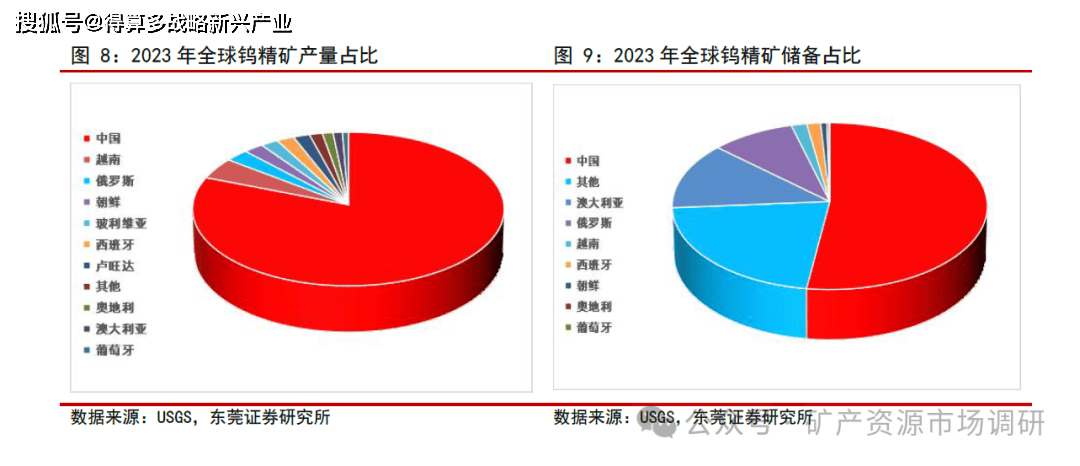 我國(guó)的鎢礦儲(chǔ)量、鎢礦產(chǎn)量及貿(mào)易量位于全球領(lǐng)先地位。據(jù)美國(guó)地質(zhì)調(diào)查局?jǐn)?shù)據(jù),2023 年中國(guó)鎢精礦產(chǎn)量為63000 公噸,儲(chǔ)量為2300000 公噸,均為世界第一。其他產(chǎn)量靠前的國(guó)家分別為越南、俄羅斯、朝鮮,2023 年產(chǎn)量分別為3500、2000、1700 公噸,其他儲(chǔ)量靠前的國(guó)家分別為澳大利亞、俄羅斯及越南,其2023 年儲(chǔ)量分別為570000、400000、74000 公噸。
