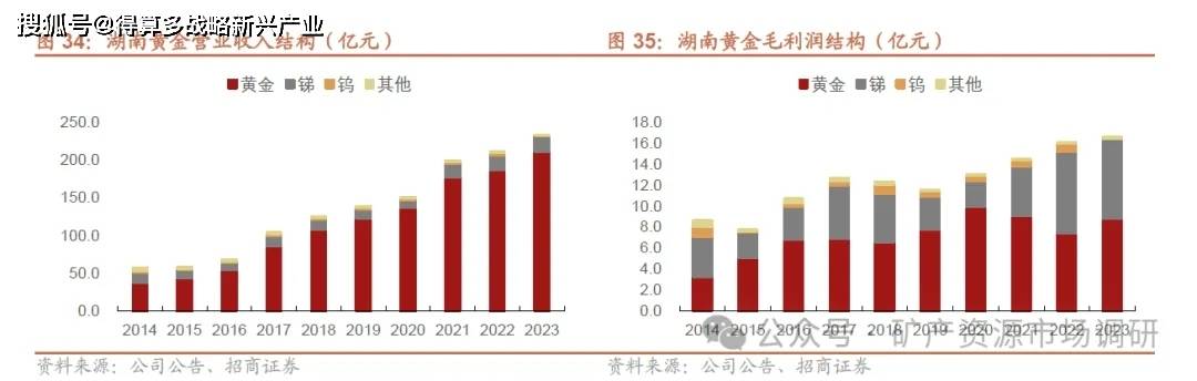 2023 年公司實(shí)現(xiàn)營(yíng)業(yè)收入233 億元,同比增長(zhǎng)10.8%;實(shí)現(xiàn)歸母凈利潤(rùn)4.9 億元,同比+11.8%。黃金、銻業(yè)務(wù)營(yíng)業(yè)收入占比分別為90.6%/8.5%,毛利潤(rùn)占比53.1%/45.9%,金銻共同構(gòu)成驅(qū)動(dòng)公司業(yè)績(jī)?cè)鲩L(zhǎng)的重要引擎。