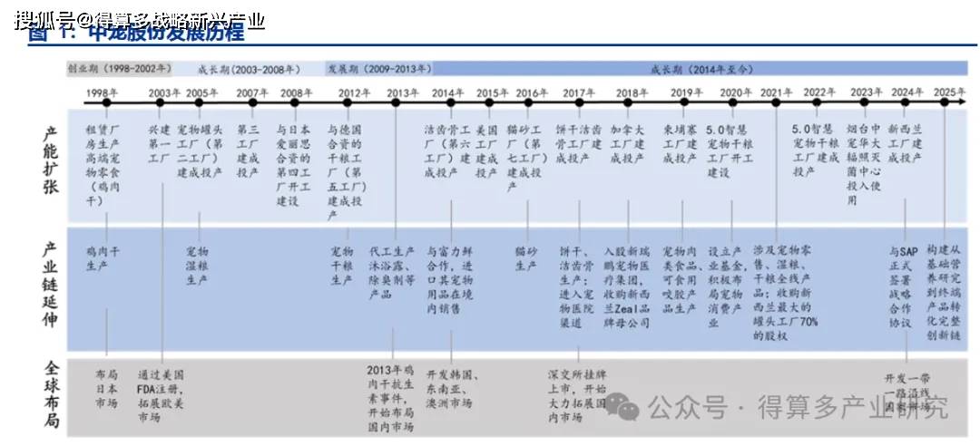 (1)創(chuàng)業(yè)期(1998-2002 年):1998 年,創(chuàng)始人郝忠禮先生從外貿(mào)行業(yè)中察覺到日本寵物食品行業(yè)的巨大商機,故創(chuàng)立了煙臺中幸食品等企業(yè),最初主要是為日本品牌商代工雞肉干等寵物零食。